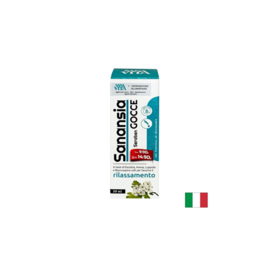 Sanavita Sanansia Seraben Gocce е специализирана хранителна добавка, предназначена да поддържа нормалното състояние на нервната система и да облекчава безпокойството и напрежението. Продуктът се предлага под формата на капки, които са удобни за употреба навсякъде и по всяко време. Формулата включва традиционни билки, известни със своите успокояващи свойства.