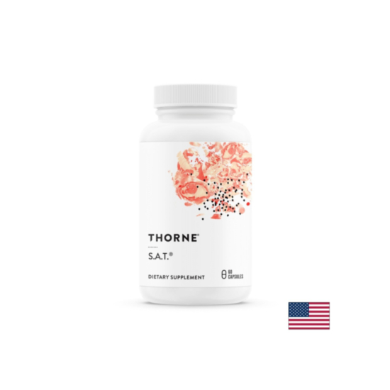 S.A.T. Натурален комплекс за чернодробното здраве Със силимарин, екстракт от артишок и куркума 60 капсули е част от детокс серията от продукти на американската компания Thorne. Не съдържа ГМО, глутен и лактоза.