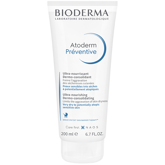 БИОДЕРМА АТОДЕРМ ПРЕВЕНТИВ КРЕМ 200МЛ е подхранващ и възстановяващ крем възпрепятства влошаването на сухата кожа при новородени бебета и възстановява по биологичен път кожната бариера. Защитава кожата. Ултра-комфортна консистенция се абсорбира мигновено от кожата и позволява незабавното обличане на дрехи. Предлага се в опаковка от 200 мл.