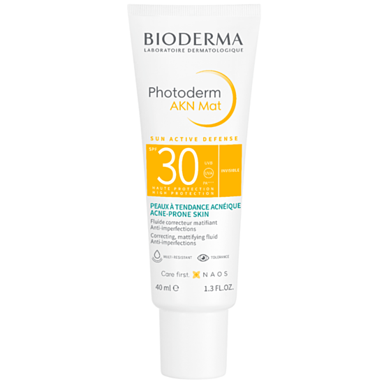 БИОДЕРМА ФОТОДЕРМ АКН МАТ SPF30 40МЛ Н - Предназначен за комбинирана и мазна кожа, склонна към акне, кремът Биодерма Фотодерм осигурява висока UVA/UVB защита и се бори срещу несъвършенствата по лицето. С матиращ ефект през целия ден, той контролира качеството на себума и ограничава появата на нови несъвършенства, благодарение на патента Fluidactiv. Салициловата и гликоловата киселина действат изглаждащо на кожния релеф. Продуктът е с незабележима флуидна текстура, която не лепне и не оставя мазни следи. Подходяща основа за грим. С аромат. Устойчив на вода, топлина и влага.