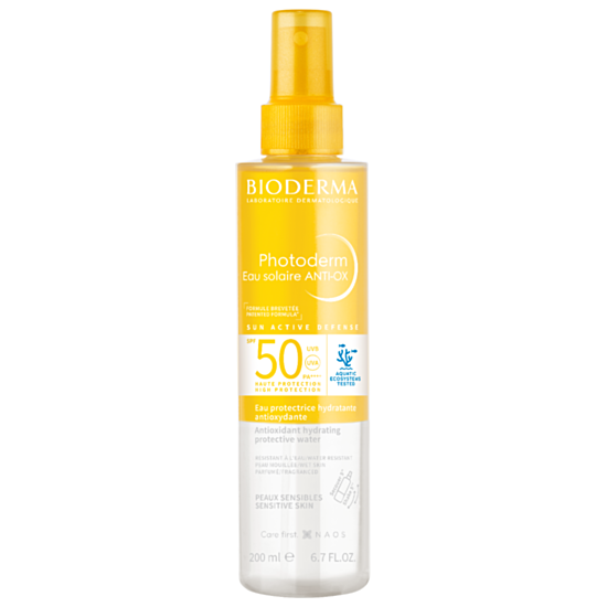 БИОДЕРМА ФОТОДЕРМ АНТИ-ОКС ДВУФАЗНА ВОДА SPF50 200МЛ подходяща за лице, тяло и коса. Разполага с прозрачна и хидратираща текстура. Предпазва кожата от процесите на стареене, освежава я и хидратира за 8 часа. Продуктът не лепне, не оставя мазен филм. Нанася се върху влажна или суха кожа. Подходящ за чувствителна кожа.