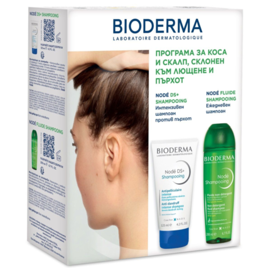 Комплектът от Bioderma Nodé е включва ежедневен шампоан DS+ и шампоан-флуид.