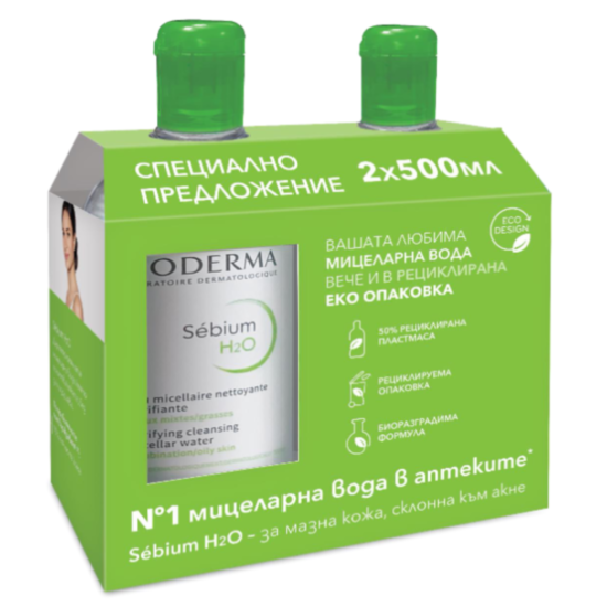 БИОДЕРМА КОМПЛЕКТ СЕБИУМ МИЦЕЛАРНА ВОДА 500МЛ Х 2 ЕКО ОПАКОВКА e мицеларна вода предназначена за комбинирана и мазна кожа и кожа, склонна към акне. Подходящ за възрастни и тийнейджъри. Мицеларната вода почиства нежно кожата, без да я изсушава. Sébium H2O почиства епидермиса в дълбочина и намалява мастната секреция. Специалната формула съдържа патентования коригиращ комплекс Fluidactiv™, който регулира качеството на себума, за да предотврати разширяването на порите и да направи кожата по-чиста. Биодерма Себиум Мицеларна вода за мазна и акнеична кожа има действие 4 в 1: почиства, успокоява, освежава и тонизира кожата. Много добра толерантност. Без парабени. Дерматологично тестван продукт. Некомедогенен.