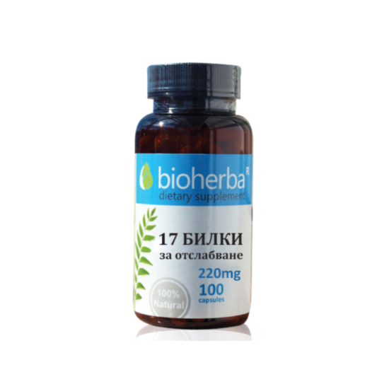 Bioherba 17 билки за отслабване е хранителна добавка под формата на софтгел капсули с уникална комбинация от билки, детоксикираща черния дроб, улесняваща обмяната на веществата в организма и изхвърлянето на ненужните шлаки и мастни депа. Съдържа жълт кантарион, лен, пчелник, мащерка, маточина, слез, глог цвят, хмел, анасон, върбинка, резене, морач, жълта комунига, агримония, коприва, мента лист, синя жлъчка.