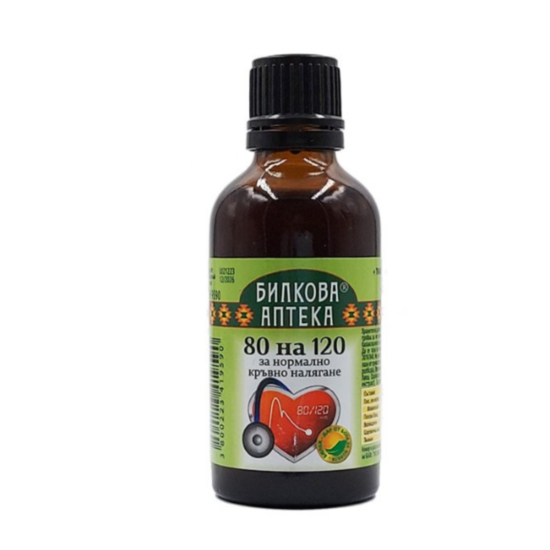 БИОХЕРБА ТИНКТУРА 80 НА 120 НОРМАЛНО КРЪВНО НАЛЯГАНЕ 50МЛ е хранителна добавка, която спомага за регулирането на високо кръвно налягане, благодарение на натуралния си състав от билки. Биохерба Билкова аптека Тинктура 80 на 120 съдържа в състава си екстракти от котешка стъпка, глог лист и цвят, спиреа цвят, хвощ, великденче, царевична коса 1:5 eквивалент на 250 mg. сухо вещество.