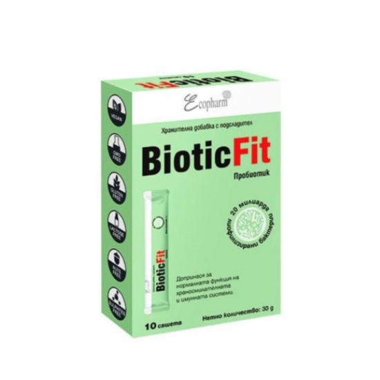 БИОТИКФИТ САШЕТА Х 10 ЕКОФАРМ - Биотикфит е хранителна добавка с подсладител, пробиотик с 20 млрд лиофилизирани бактерии. Допринася за нормалната функция на храносмилателната и имунната системи. Подходящо за вегани и вегетарианци.