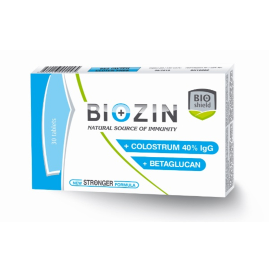 Biozin е хранителна добавка, която ефективно повишава имунитета, благодарение на своя мощен комплекс от: коластра /обогатена с 40% IgG ,лактоферин/, бета-глюкан 1,3Д, екстракт от ехинацея, инозитол и цинк.