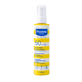 Mustela Spray Solaire Haute Protection SPF 50+ е слънцезащитен крем за деца и бебета с консистенция на спрей и може да се нанася както по тялото, така и по лицето. Неговата патентована натурална съставка, която съдържа извлечени захари от авокадо, се грижи да подсили кожната бариера и да съхрани стволовите клетки.