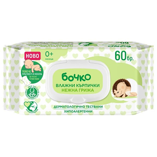 Плътните и меки кърпички Бочко - Нежна грижа, улесняват почистването на кожата без излишно търкане и без натиск - само нежна грижа за най-нежните местенца. За бързо и лесно почистване в зоната на пелените при новородени и малки бебенца.
