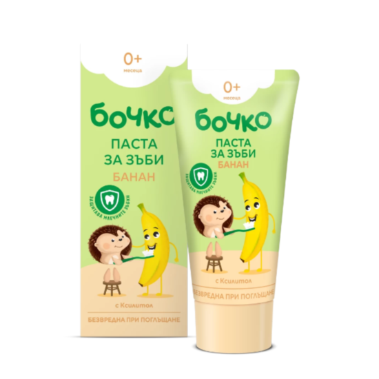 БОЧКО ПАСТА ЗА ЗЪБИ БАНАН 50МЛ се грижи за хигиената на първите зъбки. Специалната формула с ниска абразивност нежно почиства зъбките, а натуралният ксилитол предотвратява развитието на бактерии, причиняващи кариес и предпазва венците от възпаление. Подбраните съставки спомагат и за заздравяване емайла на млечните зъбки. Пастата не съдържа флуор, което я прави безвредна при поглъщане. Не съдържа консерванти и оцветители. Лекият плодов аромат помага за бързо приучаване на първа устна хигиена при бебето и малкото дете.