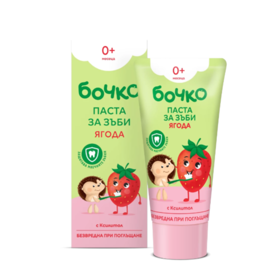 БОЧКО ПАСТА ЗА ЗЪБИ ЯГОДА 50МЛ се грижи за хигиената на първите зъбки. Специалната формула с ниска абразивност нежно почиства зъбките, а натуралният ксилитол предотвратява развитието на бактерии, причиняващи кариес и предпазва венците от възпаление. Подбраните съставки спомагат и за заздравяване емайла на млечните зъбки. Бебешката паста не съдържа флуор, което я прави безвредна при поглъщане. Не съдържа консерванти и оцветители. Лекият плодов аромат помага за бързо приучаване на първа устна хигиена при бебето и малкото дете.