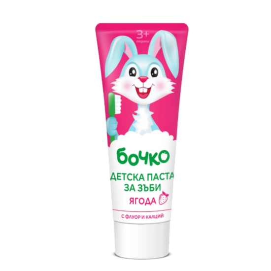 БОЧКО ПАСТА ЗА ЗЪБИ ЗА ДЕЦА С АРОМАТ ЯГОДА 3+ 75МЛ е детска паста за зъби с аромат на ягода. Специалната и формула се грижи за ежедневната хигиена на детските зъбки и венци. Заздравява зъбния емайл и повишава реминерализацията на зъбките с добавения калций. Предотвратява развитието на кариес и се грижи за здравето на венците посредством включения флуор.