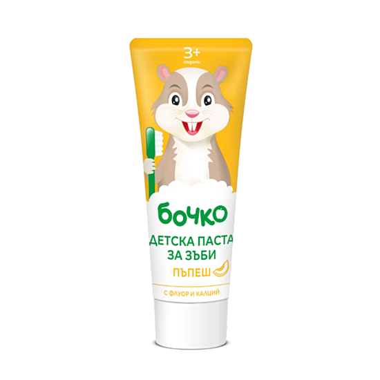 БОЧКО ПАСТА ЗА ЗЪБИ ЗА ДЕЦА С АРОМАТ НА ПЪПЕШ 3+ 75 МЛ е детска паста за зъби с аромат на пъпеш. Специалната и формула се грижи за ежедневната хигиена на детските зъбки и венци. Заздравява зъбния емайл и повишава реминерализацията на зъбките с добавения калций. Предотвратява развитието на кариес и се грижи за здравето на венците посредством включения флуор. Свежият вкус и приятен аромат помагат за приучване към редовна устна хигиена.