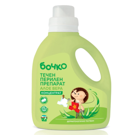 БОЧКО ТЕЧЕН ПЕРИЛЕН ПРЕПАРАТ АЛОЕ ВЕРА 1.1Л. е течен перилен препарат с нежна формула и вложен натурален сапун. Има отлично изпиращо действие и ефикасно отстранява упоритите петна от бебешките и детски дрешки. Изключително грижовен към нежната и чувствителна кожа на бебето. Препаратът Бочко съдържа 100% разтворими активни съставки, които не остават в бебешките дрешки след изпиране и изплакване. Не съдържа оцветители и фосфати. С отличен изпиращ ефект дори при 30°C. Вложеният екстракт от Алое Вера има успокояващо действие, благодарение на което предпазва кожата от раздразнения и помага за омекотяване на тъканите.