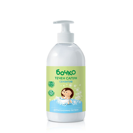 БОЧКО ТЕЧЕН САПУН СЕНЗИТИВ 500МЛ е течен сапун за ръце, специално предназначен за чувствителната детска кожа. Той почиства добре кожата, без да я изсушава, а добавеният глицерин прави кожата мека и запазва естественият и баланс. Продуктът е подходящ за употреба при чувствителна и склонна към алергии кожа. Сапунът може да се ползва от деца и от възрастни.