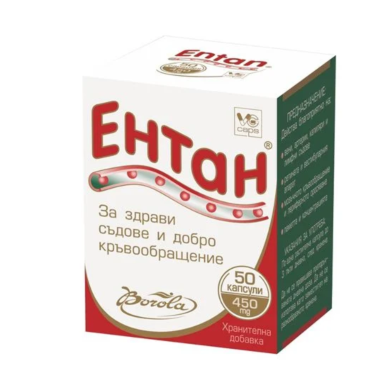 Ентан е специално създадена хранителна добавка от Борола, съдържаща комплекс от мощния антиоксидант проантоцианидин, в комбинация със стандартизиран екстракт от известното растение Гинко Билоба, която подобрява кръвообращението, укрепва стените на кръвоносните съдове и подкрепя дейността на цялата кръвоносна система. Ентан стимулира кръвооросяването на крайниците, ушите, мозъка и ретината и е изключително ефективен при разширени вени, хемороиди, шум в ушите и световъртеж. Ентан ефективно намалява отоците и усещането за "тежки крака". Ентан благоприятства мозъчната функция и подобрява паметта и концентрацията. Ентан има силно противовъзпалителлно действие, спомага за заздравяването на колагена и еластина. Ентан засилва кръвната циркулация и спомага за поддържане еластичността и проводимостта на кръвоносните съдове, като по този начин не позволява запушването на кръвоносните съдове и образуването на тромби. Ентан подобрява течливостта на кръвта и спомага транспортирането на кислород и хранителни вещества към клетките. Ентан е изключително подходящ за хора, които имат нарушено кръвоснабдяване на ретината, хора, страдащи от хронична лимфна и венозна недостатъчност, пациенти с периферни съдови заболявания, диабет, синдром на рейно и др, при постоперативен и посттравматичен оток, мозъчна атеросклероза и пациенти, претърпели инсулт. Поради съдържанието на флавоноиди с мощно антиоксидантно действие, Ентан предпазва клетките от разрушителното влияние на свободните радикали. При употреба заедно с противосъсирващи средства (антикоагуланти), Ентан потенцира техния ефект.