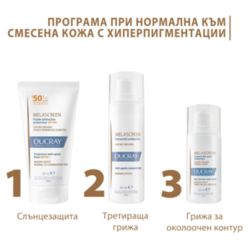Ducray ДЮКРЕ МЕЛАСКРИЙН РУТИНА ПРИ НОРМАЛНА КЪМ СМЕСЕНА КОЖА С ХИПЕРПИГМЕНТАЦИИ - КОНЦЕНТРАТ 30МЛ + ОКОЛООЧЕН КРЕМ 15МЛ + ФЛУИД UV SPF50+ 50МЛПромо цена 89,89 лв. / 45,96 € Редовна цена 128,42 лв. / 65,66 €