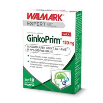 Walmark ГИНКО ПРИМ МАКС ТАБЛ. 120 МГ Х 30 + 10 ВАЛМАРКПромо цена 28,69 лв. / 14,67 € Редовна цена 29,99 лв. / 15,33 €