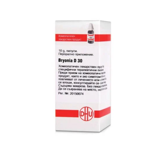 DHU Bryonia D30 представлява хомеопатичен лекарствен продукт, получен от екстракт от свежи части от корена на растението Дива тиква преди цъфтежа му. Бриония е монопрепарат за приложение при главоболие, остри възпаления на дихателните пътища, а също и при вдигане на висока температура. При респираторните проблеми чест симптом е изразена сухота на лигавиците. Препоръчва се още при заболявания на стомашно-чревния тракт. Намира приложение като средство за облекчаване на ревматични болки. Хомеопатичните лекарства представляват силно разредени субстанции на неорганични соли, минерали, растения, тъкани, отрови и др., които носят в себе си специфичното действие, характерно за веществото, от което са получени. Най-общо казано, действието на хомеопатичното лекарство се състои в подаването на сигнал към организма, който да мобилизира самооздравителните си сили на всички нива: умствено, емоционално и физическо.