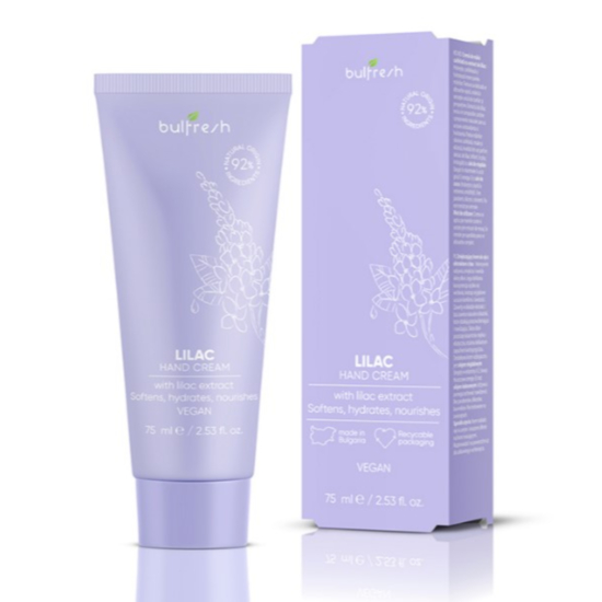 БУЛФРЕШ ОМЕКОТЯВАЩ КРЕМ ЗА РЪЦЕ С ЕКСТРАКТ ОТ ЛЮЛЯК 75МЛ - Интензивно подхранва, омекотява и хидратира кожата на ръцете. Нежната му текстура попива бързо, създавайки неповторимо усещане за комфорт и свежест. Включеният в състава екстракт от люляк съдържа естествени компоненти, които притежават антиоксидантно и хидратиращо действие. Кожата на ръцете остава кадифено мека и еластична, обгърната в нежен аромат на цъфнал люляк. Допълнително обогатен с бадемово масло (богато на витамини А, Е иомега-3 мастни киселини) и кокосово масло (подхранва и спомага за задържането на влага). Без парабени, силикони, изкуствени оцветители.