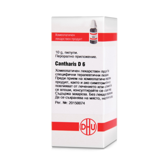 DHU Cantharis D6 представлява хомеопатичен лекарствен продукт, получен от накисната в алкохол испанска муха (бръмбър). Кантарис е монопрепарат за прием при различни кожни заболявания, както и остри заболявания на пикочните пътища. Изсушено, насекомото е богато на кантаридин, което е органично вещество с конгестивно и разраняващо действие в областта на пикочните пътища. Освен това са добър източник на фосфати, калциеви и магнезиеви деривати, холестерол, пикочна киселина, органични мазнини. Препаратът се препоръчва за облекчаване на пареща болка в пикочния мехур, болка при уриниране. Спомага при коремни спазми, както и мехури от изгаряне. Хомеопатичните лекарства представляват силно разредени субстанции на неорганични соли, минерали, растения, тъкани, отрови и др., които носят в себе си специфичното действие, характерно за веществото, от което са получени. Най-общо казано, действието на хомеопатичното лекарство се състои в подаването на сигнал към организма, който да мобилизира самооздравителните си сили на всички нива: умствено, емоционално и физическо.