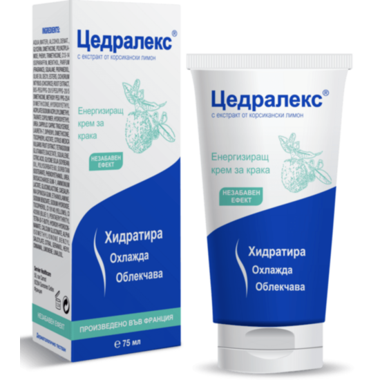 Енергизиращият крем за крака Цедралекс с незабавния си охлаждащ ефект, облекчава чувството за тежест в краката. Меката му и разтапяща се деликатно парфюмирана текстура нежно хидратира кожата. Тъй като тя не лепне и не оставя петна, кремът е подходящ за употреба по всяко време на деня, за да възвърне комфорта и лекотата на краката.
