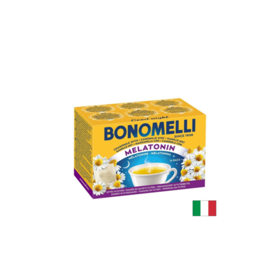 Билковият чай на Bonomelli съдържа екстракт от цвят на лайка, в комбинация с мелатонин и магнезий, действа успокояващо, редуцира стреса и улеснява заспиването