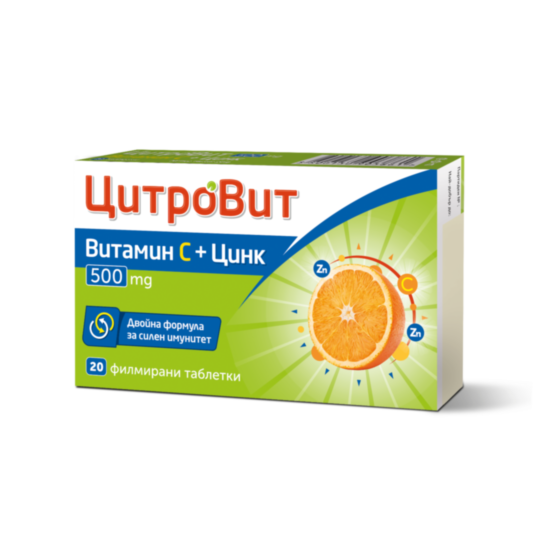 Цитровит Витамин C + Цинк хранителна добавка с двойна формула за силен имунитет, комбинираща витамин С и цинк. Подсилва функциите на имунната система. Спомага за увеличаването на защитните сили на организма към инфекции.