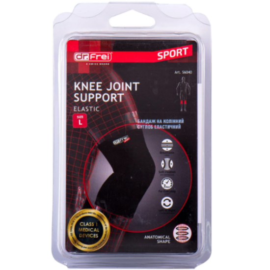 Д-Р ФРАЙ ЕЛАСТИЧНА НАКОЛЕНКА 6040-L - Еластичният бандаж на Dr. Frei осигурява комфортно и сигурно фиксиране на колянната става, без да ограничава подвижността ѝ. Той има анатомична форма и е удобен за ежедневна употреба, като е подходящ за левия и десния крак. Задържането на топлина и компресията намаляват риска от навяхвания или травми, а дишащата еластична материя осигурява максимален комфорт. Продуктът спомага за правилното разпредяне на натоварването върху ставата по време на движения, облекчавайки болката при артрит, увреждане на менискуса и възпалителни и дегенеративни заболявания (начални стадии на синовит, периартикуларен оток, бурсит и артроза), ако загряването не е противопоказно.