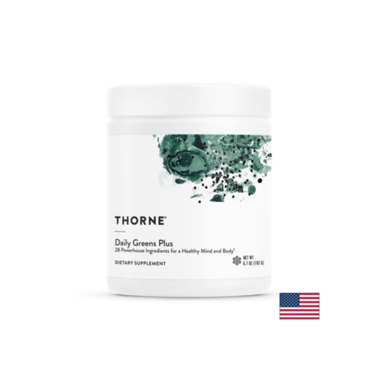 Daily Green Plus За физическа и умствена устойчивост Прахообразна формула 192 гр, 30 дози е висококачествен продукт с изцяло натурален състав. Произведен е от американската компания Thorne. Не съдържа ГМО, химикали, глутен, соя и лактоза. Подходящ е за вегетарианска и веган диета.