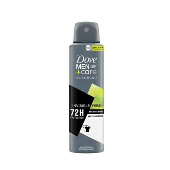 ДАВ ADVANCED ДЕЗОДОРАНТ СПРЕЙ МЪЖКИ INVISIBLE FRESH 150МЛ е дезодорант спрей против изпотяване, създаден специално за мъже, който осигурява защита от неприятни миризми до 72 часа. Подходящ е за всички типове кожа. Той съдържа 1/4 хидратантен крем и формула с революционната тройна технология, които се грижат за кожата на подмишниците, като я подхранват, хидратират и предпазват от раздразнения и същевременно осигуряват сигурна и дълготрайна защита от изпотяване. Подходящ за ежедневна употреба. Не съдържа алкохол и парабени. Дерматологично тестван продукт.