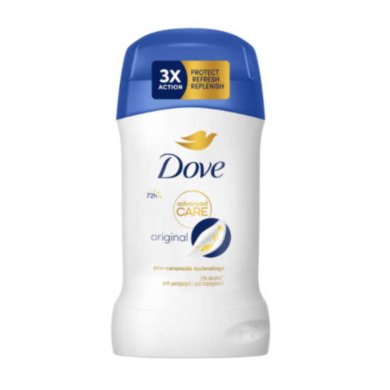 DOVE ADVANCED CARE ORIGINAL 72h Дезодорант стик против изпотяване без алкохол. Нежна към кожата формула с патентована технология за тройно овлажняване, обогатена с ¼ хидратиращ крем и витамин Е. Осигурява дълготрайна 72-часова защита против изпотяване и неприятни миризми. Притежава лека и приятна консистенция, попива бързо и не оставя бели следи по дрехите. Освежаващият му аромат създава усещане за свежест и чистота през целия ден.