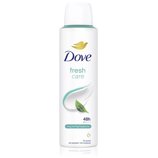 Дезодорант-спрей Dove Fresh Care е създаден специално за жени и осигурява до 48 часа надеждна защита от изпотяване, като същевременно се грижи за кожата на подмишниците.
