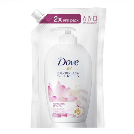 Dove Nourising Secrets Glowing Ritual Handwash with Lotus Flower Extract & Rise Water е течен сапун за ръце с овлажняващо и подхранващо действие. Дав Течен сапун за ръце с лотос и оризова вода съдържа ¼ овлажняващ крем и меки почистващи съставки, които не изсушават кожата и спомагат за запазване на естествената хидратация на кожата. Сапунът нежно почиства кожата и я прави по-мека, по-гладка и по-здрава. Нежният и деликатен аромат на сапуна оставя дълготрайно усещане за свежест и чистота. Подходящ за всекидневна употреба. Без парабени. Дерматологично тестван продукт.
