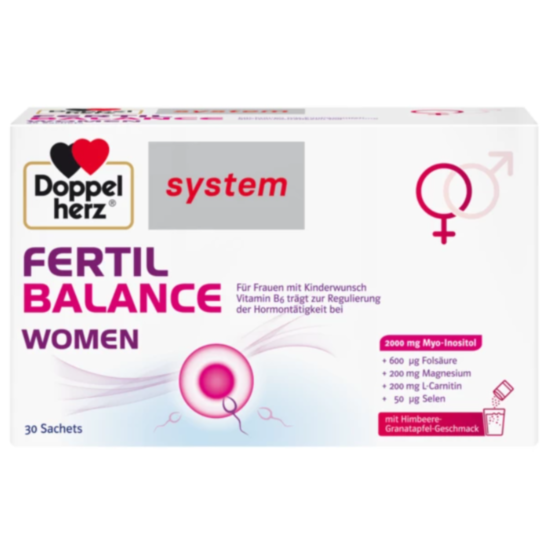Допелхерц® систем Фертил Баланс за Жени e специално разработена комбинация в подкрепа на фертилитета включително за дамите с репродуктивни проблеми, която включва 2000 mg инозитол, 600 μg фолиева киселина, L-карнитин, коензим Q10, 11 витамина и микроелемента. Не съдържа хормони.