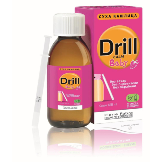 Drill Calm Baby е успокояващ сироп за суха кашлица при деца на възраст от 6 месеца до 6 години, с вкус на ягода. Дрил Калм Бейби облекчава дразненето, свързано със сухата кашлица, като създава покривен филм и овлажнява гърлото. Не съдържа захар, оцветители и парабени. Опаковката е снабдена с дозираща спринцовка за перорално приложение, градирана до 5мл.
