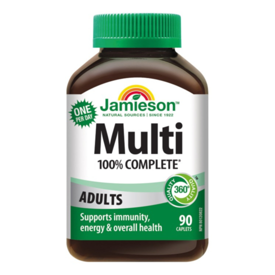 Jamieson Multi Adults Мултивитамини за възрастни x 90, e хранителна добавка, специално формулирана с витамини и минерали, които спомагат за повишаване на енергийните нива на организма и подсилват имунитета. Този продукт набавя 100% от дневната нужда на организма, тонизира и подпомага общото здраве. Балансиран и всеобхватен мултивитаминен комплекс, който съдържа витамини A, B3, B5, B6, B12, C, D3, E, биотин и фолиева киселина, заедно с важни минерали, които подпомагат цялостното здраве.