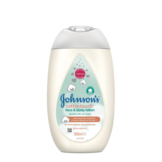 ДЖОНСЪНС ЛОСИОН ЗА ЛИЦЕ И ТЯЛО ПАМУК 300МЛ - е лосион за лице и тяло на водна основа, подходящ за новородени от първия им ден. Овлажнява, омекотява и предпазва деликатната бебешка кожа. Формулата на продукта е разработена с истински памук. Има лека текстура, която позволява на кожата да диша. Не оставя следи и чувство за лепнене. Клинично доказаната формула за мекота на лосиона е специално предназначена за чувствителната бебешка кожа. Продуктът има балансирано рН и е хипоалергенен. Дерматологично и педиатрично тестван. Без парабени, фталати, оцветители.