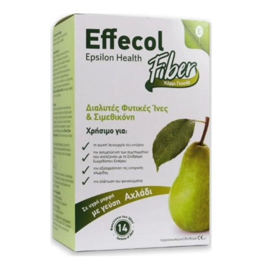 Epsilon Health Effecol Fiber Sachet представлява медицинско изделие с вкус на круша за облекчаване на дискомфорт в хранително-чревния тракт. Формулата на Ефекол Фибри комбинира течни фибри (частично хидролизирана Гума Гуар) и симетикон, които имат свойството да задържат голямо количество течност и по този начин допринасят за редуциране симптомите на Синдрома на дразнимото дебело черво. Пребиотичният ефект на препарата спомага за нормализиране на чревната флора.