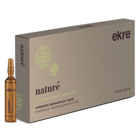 ЕКРЕ NATURE ВЪЗСТАНОВЯВАЩИ АМПУЛИ С МИНЕРАЛИЗИРАЩО МАСЛО 10 Х 10МЛ представлява възстановяващи ампули за третирана коса, които са разработени по специална формула с минерални соли, която има ефикасно реструктуриращо и защитно действие. Ампулите могат да се използват преди и след къдрене, боядисване и изрусяване. Употребата на продукта се препоръчва и при дехидратирана, деминелезирана коса със сухи и увредени краища. Ампулите притежават силно омекотяващо действие и улесняват разресването и оформянето на прическата.