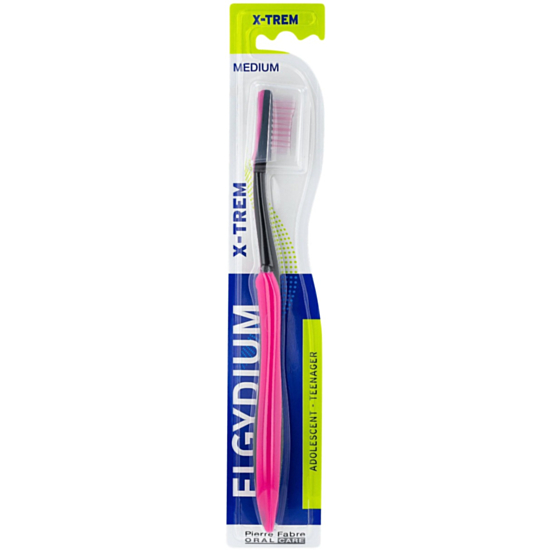 ЕЛГИДИУМ ЧЗ ЕКСТРИЙМ МЕДИУМ - Четката е предназначена за чувствителните зъби и венци на тийнейджърите. Тя е разработена с висококачествени, фино заоблени найлонови влакна и ергономична дръжка, които я правят мека и удобна за използване. Предлага се с предпазно капаче, за да може да се пренася хигиенично в раница.