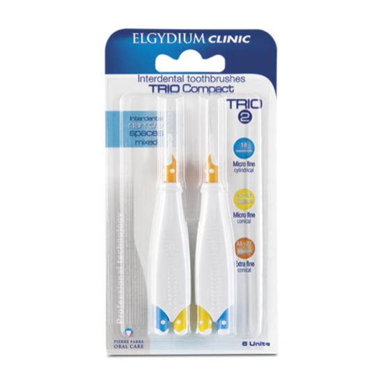 ЕЛГИДИУМ ЧЗ ИНТЕРД. ТРИО КОМПАКТ 2 МИКС ТЕСНИ 711026 - Специално създадени за почистване на зъбни пространства и брекети. Удобни и лесни за употреба. Комбинация от 3 четки за зъби в един общ накрайник. Гъвкави и устойчиви: съчетание, постигнато благодарение на иновативната система на ултрафиния сноп (0.38 - 0.5 мм). Тествани за изтръгване до 30 Нютона. Ергономични и хигиенични: релефна дръжка, конструирана за удобна употреба и за предпазване на накрайниците от замърсяване и деформации.