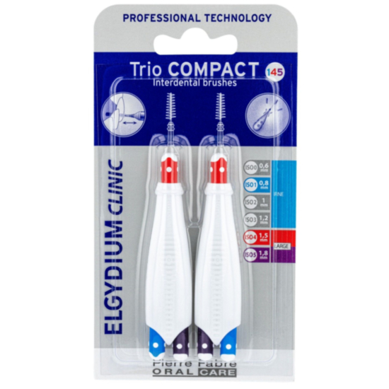 Elgydium Clinic Trio Compact 145 Interdental Toothbrushes са висококачествени интердентални четки за зъби, които са специално предназначени за широки междузъбни пространства. Комбинация от 3 четки за зъби в един общ накрайник. Ефективно премахват денталната плака. Гъвкава и устойчива глава за по - добър достъп в труднодостъпните зони. Два цвята влакна: бели за визуализиране на чувствителни венци, ако има кървене и черни - за улеснено въвеждане на интерденталната четка и за видимо отстраняване на зъбната плака.