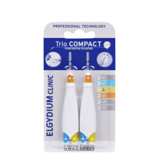 ЕЛГИДИУМ КЛИНИК ТРИО КОМПАКТ 1-2-3 /0,8,1,1,2ММ/ТЕСНИ МЕЖДУЗЪБНИ ПРОСТРАСТВА - Създадени за ефективно почистване на междузъбните пространства, компактните интердентални четки ELGYDIUM ClinicTrio Compact допълват ежедневните грижи за устна хигиена и са особено препоръчителни за хора с импланти, брекети или открити зъбни шийки. Използването им намалява натрупването на плака, която е причина за кариес и заболявания на венците.