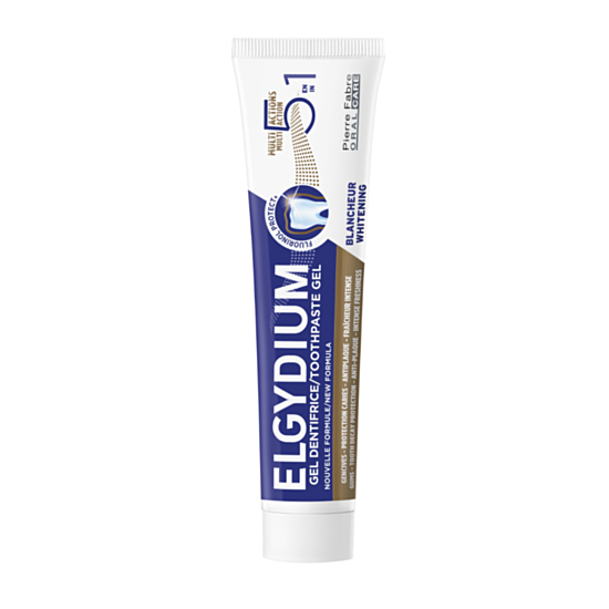 ELGYDIUM 5-в-1 мултифункционална паста за зъби е създадена, за да отговори на нуждите на Вашата орална хигиена. Тя укрепва венците благодарение на антиоксидантното действие на Aquacyane¹, помага за предотвратяване на натрупването на плака и избелва зъбите², укрепва зъбния емайл за предотвратяване на появата на кариеси и освежава дъха. ELGYDIUM мултифункционална паста за зъби съдържа комплекс Fluorinol® Protect+ (комбинация от Fluorinol® и Chitosan MS), който фиксира 10 пъти повече флуорид върху повърхността на емайла³, за да помогне за реминерализация и защита на зъбите. Мисията на ELGYDIUM мултифункционална паста за зъби е да предложи паста за зъби, адаптирана към всичките Ви нужди.
