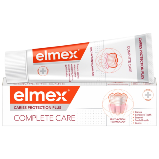 ЕЛМЕКС ПАСТА ЗА ЗЪБИ КЪМПЛИЙТ КЕЪР КАРИЕС ПРОТЕКШЪН ПЛЮС 75МЛ е паста за зъби, която предпазва от кариес, съдържаща калаен флуорид и цинков фосфат, за да осигури пълна грижа за здрава уста. Пастата е с клинично доказата технология, която при използване сутрин и вечер е много ефективна за защита срещу кариес.