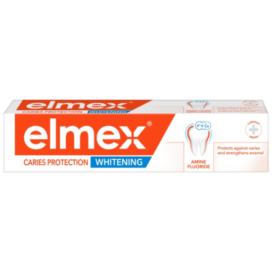 ЕЛМЕКС ПАСТА ЗА ЗЪБИ КАРИЕС ПРОТЕКШЪН ИЗБЕЛВАЩА 75МЛ е избелваща паста за зъби, която едновременно реминерализира и предпазва от кариес. Нейната високо ефективната формула образува активен щит на калциев флуорид, който предпазва зъбите и поддържа реминерализиране на засегнатите емайлирани зони. Пастата ефективно избелва зъбите.
