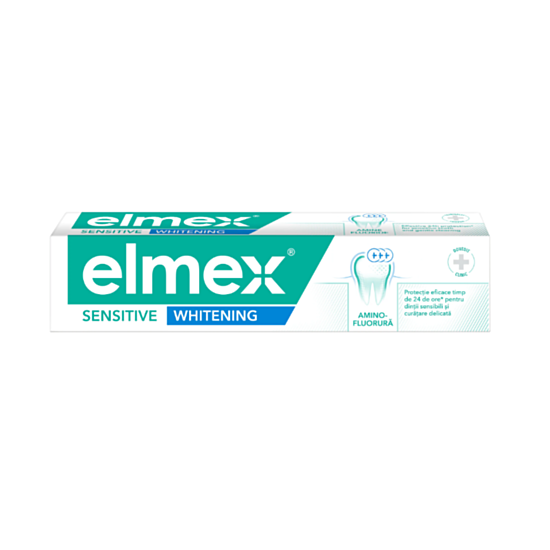 Елмекс паста за зъби Сензитив Избелваща 75мл е избелваща паста за зъби, която осигурява ежедневна защита на чувствителните зъби. Съставките и образуват защитен слой върху зъбите и ги предпазват от свръхчувствителност и кариес. Елиминира се дискомфорта, причинен от външни стимули. Пастата съдържа и допълнителни почистващи съставки, които повишават защитата на зъбите. В допълнение, специалната формула нежно и цялостно премахва оцветяванията, помагайки за възстановяване на естествената белота на зъбите.