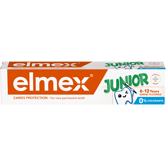 ЕЛМЕКС ПЗ ДЖУНИЪР 6-12 75МЛ е детска паста за зъби създадена специално, за да се грижи за устната хигиена на деца от 6 до 12 години. Тя осигурява ефективно и деликатно почистване на зъбите на малчуганите. Има балансиран състав и съдържание на амин флуорид, които гарантират отличното почистване и създаване на защитен слой около зъбите, необходими за тяхното здраве.