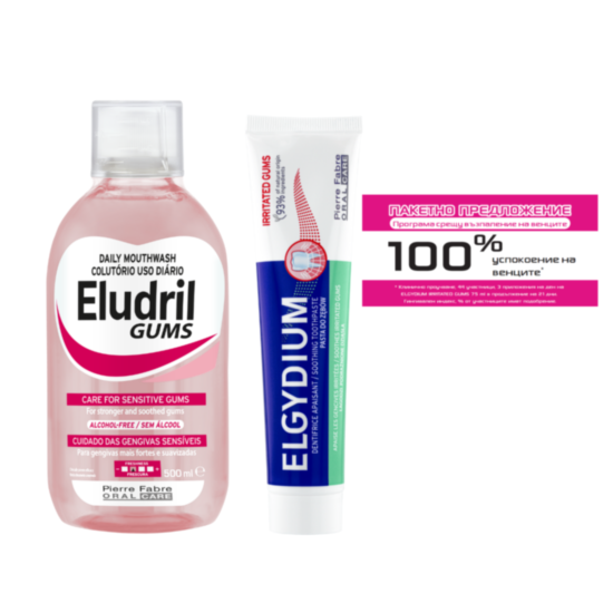 ЕЛУДРИЛ КОМПЛЕКТ ВОДА ЗА УСТА ГЪМС 500МЛ+ЕЛГИДИУМ ПАСТА ЗА ЗЪБИ РАЗДРАЗНЕНИ ВЕНЦИ 75МЛ